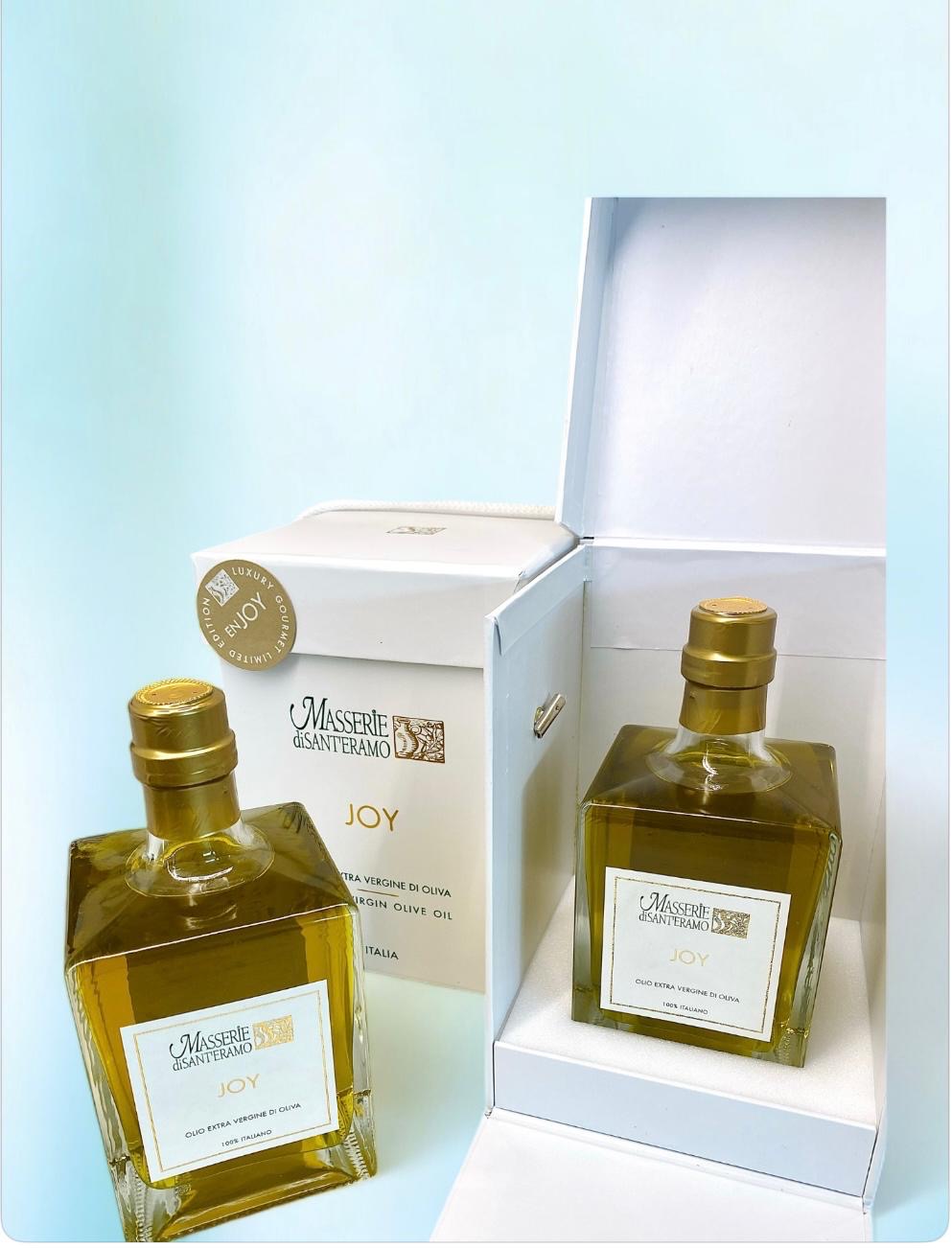 Beim Olivenöl Joy wird nur die Sorte von Ogliarola-Oliven, eine typische Olive aus der Region Apulien verwendet und es wird nicht die traditionelle Mischung verschiedener Olivensorten (Blend) vorgenommen. Nur ein kleiner Prozentsatz des in Italien produzierten Olivenöls extra vergine ist monocultivar (reinsortig), da nur die besten Ölerzeuger auch die Kenntnisse haben, um ein entsprechend exzellentes Olivenöl, mit einer hohen Konzentration an Polyphenolen, aus einer einzigen Olivensorte zu extrahieren. Bei der Suche nach Reinheit, Qualität und Exzellenz stellt das elegante native Olivenöl extra von Masserie di Sant’Eramo einen Meilenstein dar.