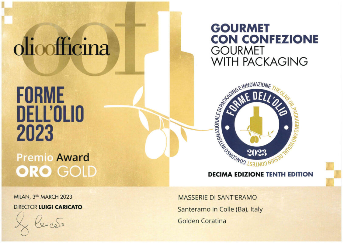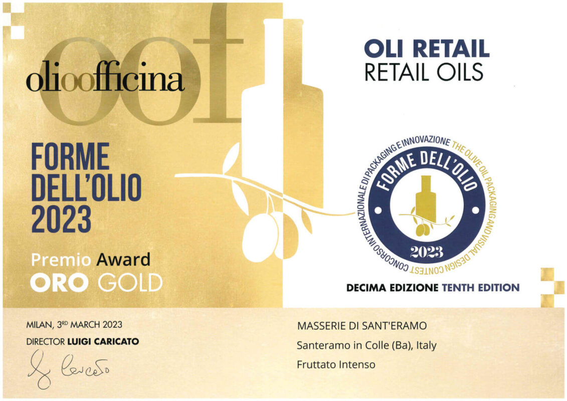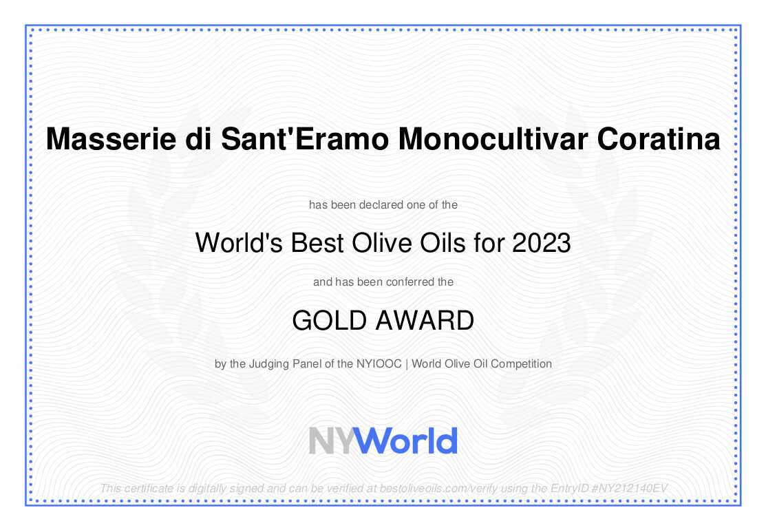 Masserie di Sant’Eramo triumphiert beim Gold Award des New Yorker Olivenöl-Wettbewerbs 2020, 2021, 2022 und 2023. Der Wettbewerb für natives Olivenöl extra findet jedes Jahr im Frühling in New York statt. Es ist der grösste und renommierteste Wettbewerb für hochwertige Olivenöle. Die jährliche Liste der Preisträger ist der massgeblichste Indikator für die besten nativen Olivenöle der Welt.