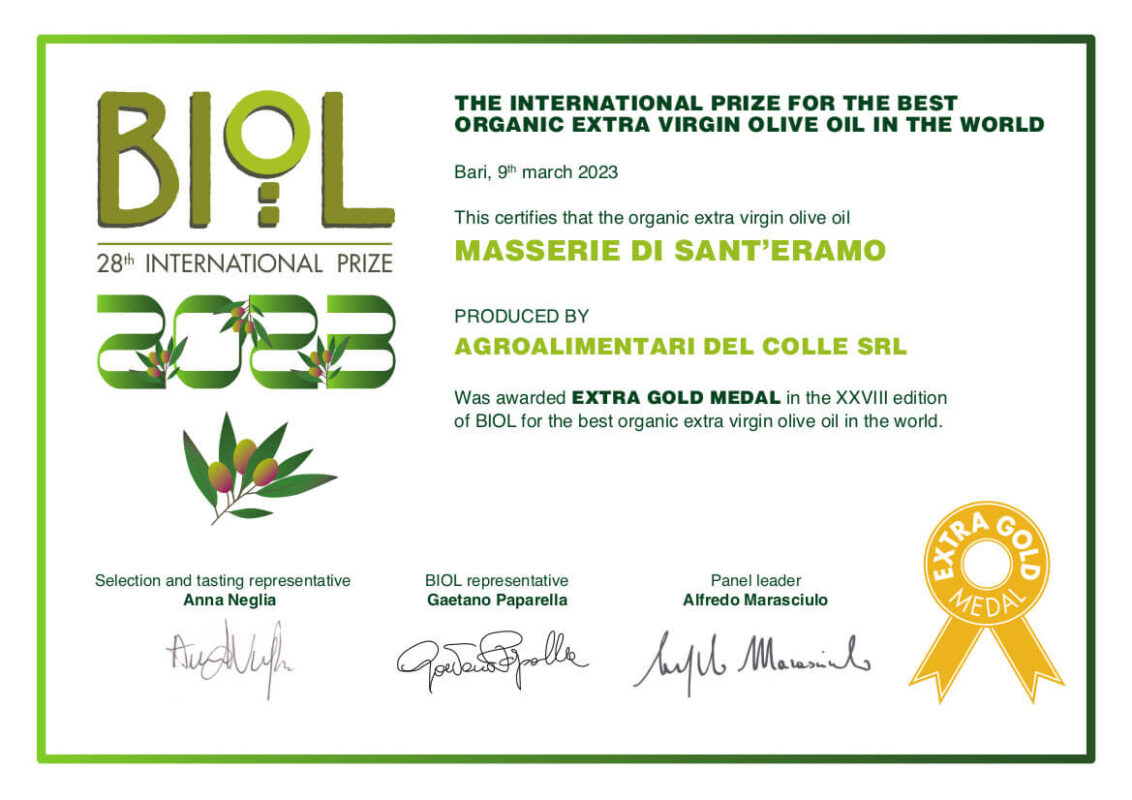 • Extra Gold Medal 2023 International Prize BIOL for the best Organic Extra Virgin Olive Oils – Organic Evo