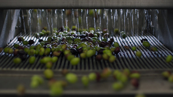 Die Oliven werden durch Absaugen von Zweiglein und Blättern gereinigt, di sonst dazu beitragen würden, einen unangenehm bitteren Geschmack im Öl zu hinterlassen. Dann werden die Oliven gewaschen, um Erde und andere Unreinheiten zu entfernen.